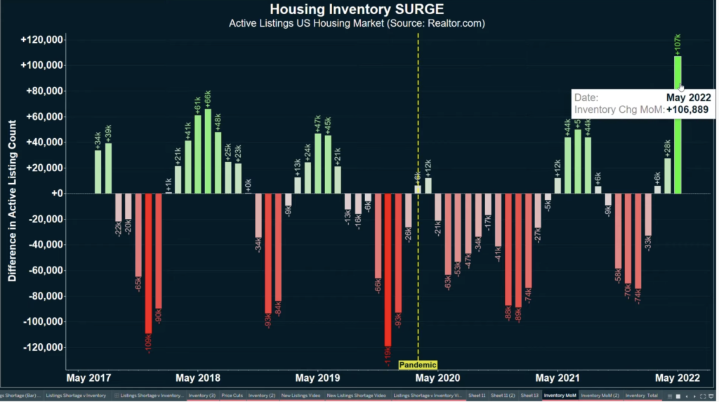 That’s also when you saw inventory rising faster in this real estate market than imagined. As you can see the graph below, the national number of new housing inventory is up over 107k units in May. That’s an increase of over 30% almost overnight. And in Delray Beach our inventory is up 22% last month from a year ago, and up over 50% from the start of this year.