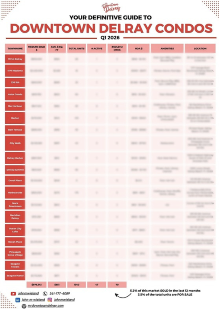 For those navigating the downtown condo market, my Condo Guide to Downtown Delray Beach breaks down HOA fees by building, outlines amenities, and explains what matters most when comparing communities.