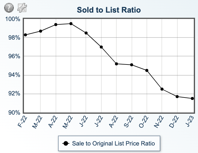 Now, look at the Sold-to-List ratio. You can see in this chart last year, May peaked at 99.6%. What that means is if you put a property on the market for $100,000, it sold for 99,600 bucks. But as you can see, it crashed all year and in January it’s 91.8%.