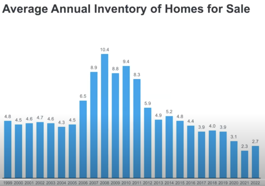 Now I want to throw in this bonus chart. It’s about the national average annual inventory of homes for sale. As you can see, it averages about 4.2 to 4.5 million homes for sale in the United States every year except for the great recession, 2008/09/10/11 when inventory spiked.