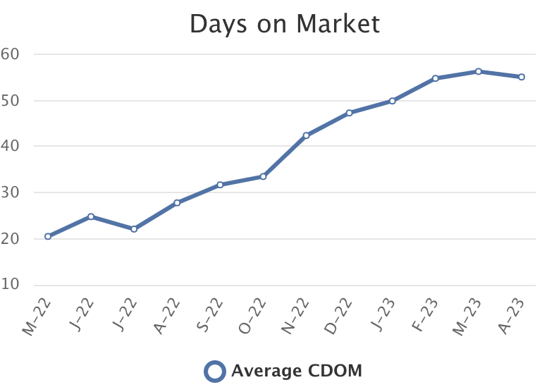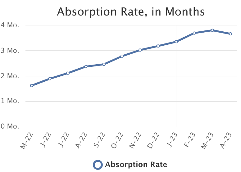 Absorption Rate means if not one new property was put on the market, how many months would it take for all the properties to sell? The absorption rate for the last year has been been going up almost in a straight line. But in April it began falling. When something breaks a trend, we make note.