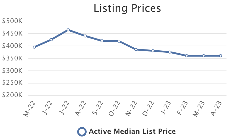 First is the median list price. As I told you last month, that’s been coming down for the last six months from $465,000 to $355,000. For the last three months, it has created a support line. It shows a value – a line – that could keep it from falling any further. And with the number of listings softening, that should hold prices right here, and maybe we’ll see prices start to rise.