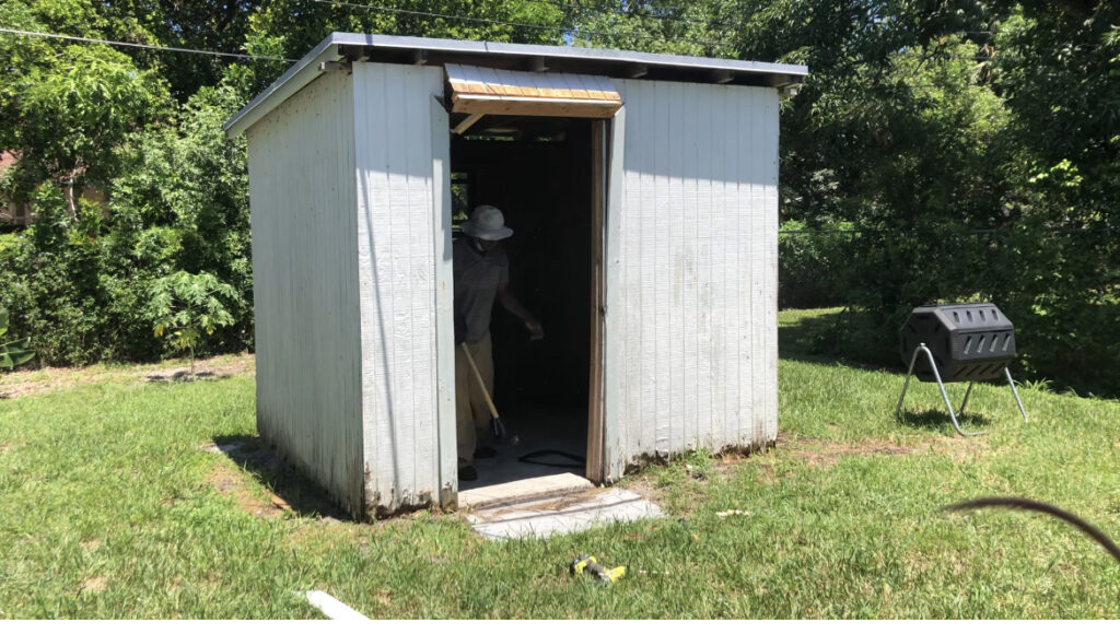 When we bought our property, our backyard was a mess. Full of trees, trees hanging over everywhere from our neighbors. And this ugly shed right smack dab in the middle of the backyard.