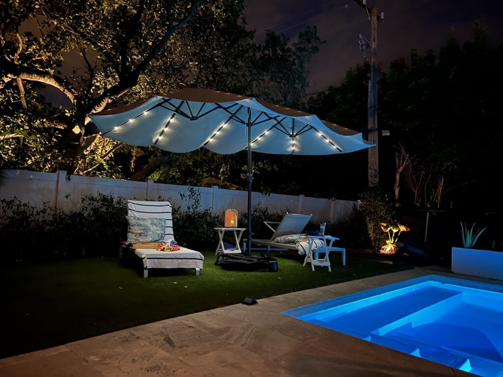 As we finish the pool project for 2022, you can see our AstroTurf installation, umbrellas, the pool, the decking, more umbrellas, a shower outside, and a nice living wall. We used the leftover travertine tiles that were cut for the pathway through our exotic plant area, bordered by aloe vera plants, hibiscus.