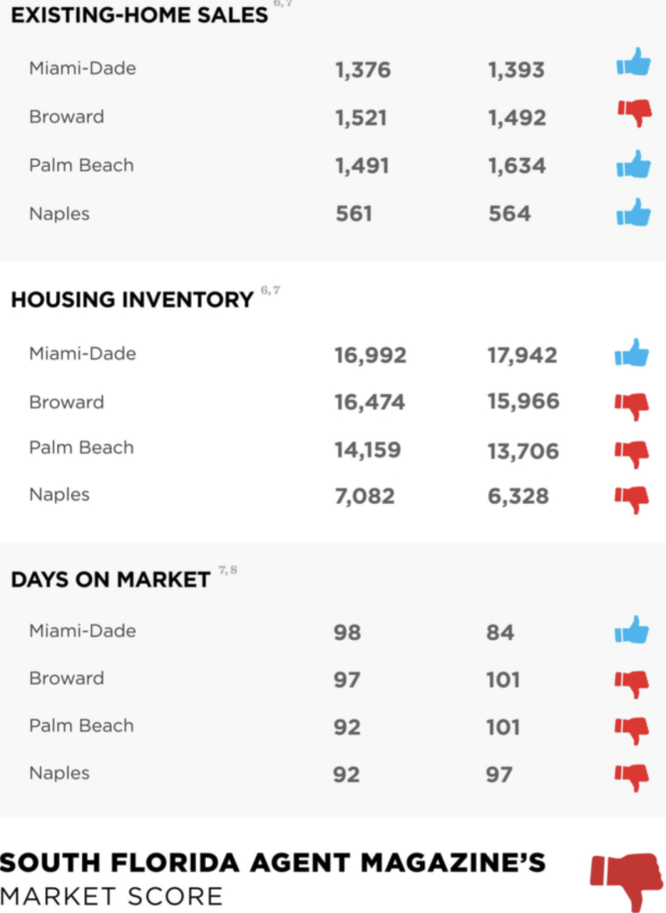 South Florida Agent magazine came out with their Year Over Year look at market indicators. You can see it in the graph below. Out of 20 categories, 14 were negative and just six were thumbs up.
