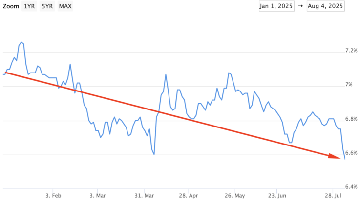 Have you seen interest rates this week? Look at the chart below. As you can see, the 30-yr fixed mortgage rate started the year at 7.07%. Today it’s near 6.57%. At 7.07% on a $320k loan, that’s a monthly payment of $2,519. At 6.57% your monthly payment is $2,412. You’re saving about $1,000 per month or $12,000 per year compared to eight months ago.