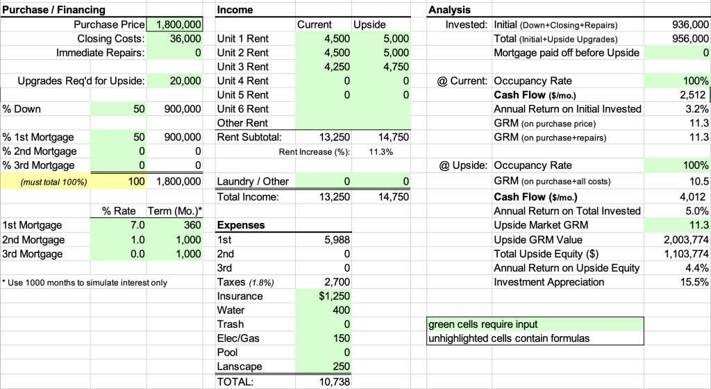 At the list price of $1.8 million, and 50% down payment, or $900k, and with current rents, you’d make 3.2% annualized rate of return (IRR). That’s a measly $2,500 monthly cashflow, or $30k per year.