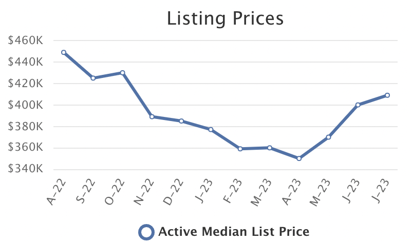 The first chart is Median List Prices. You can see for the last half of 2022, the median list price fell from $460,000 to almost $350,000. In April it turned and went vertical. Now the median price is hovering just at about $425,000. That shows you massive shift in the market overnight.
