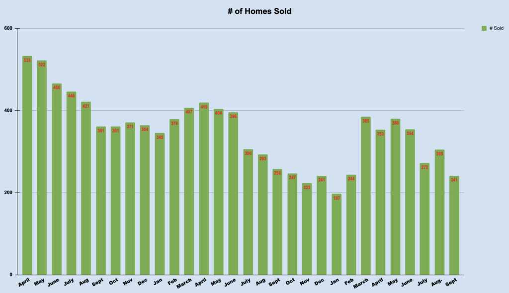 Now, here are those new charts I put together. The first one is the number of homes sold. You can see this goes back two and a half years to April of 2021. Look at September of 2021 through December.