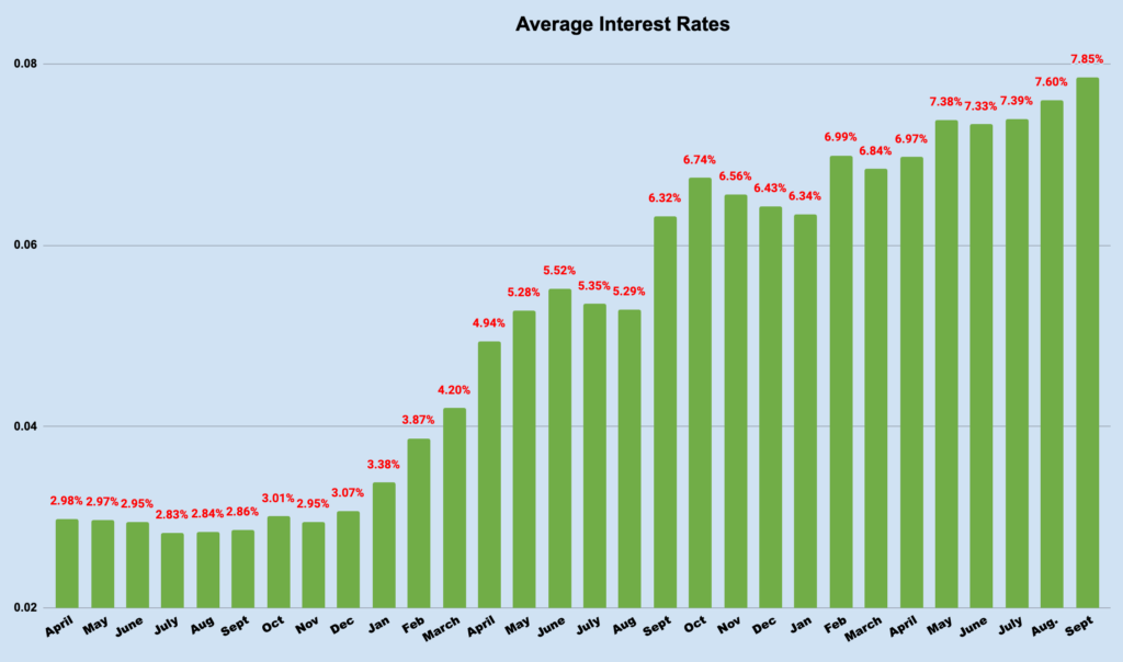 And how about interest rates? Take a look at this chart. Itβs climbed from 2.8% in July of 2021 to 7.85% today.