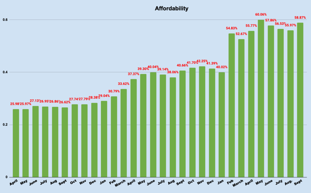 I took the average household income of a hundred thousand dollars. If you’re making more, affordability is less. If you’re making less, then affordability is more. Look at the chart. Anything over 50% means more than 50% of your income is contributed in this calculation to your mortgage based on the average sales price at the current interest rate. This is your principal interest, taxes, and insurance.